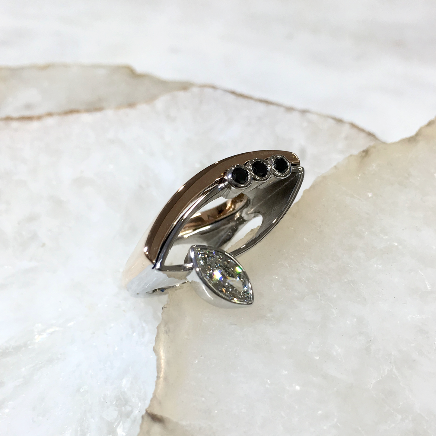 Tamara - The brilliant white marquise diamond is set off-centre and contrasted by a subtle set of black diamonds, creating a modern and sophisticated juxtaposition. Designed for those who appreciate originality and refined edge, this ring makes a statement that’s both elegant and unconventional.