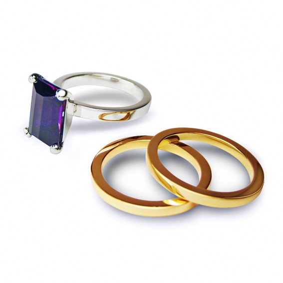 Remodeling for a client. We were given an 18ct yellow gold Amethyst ring. Our client wanted the amethyst in 18ct white gold. We suggested to use the spare gold to make two square bands for her to either wear on their own or stack them with the new white gold ring.